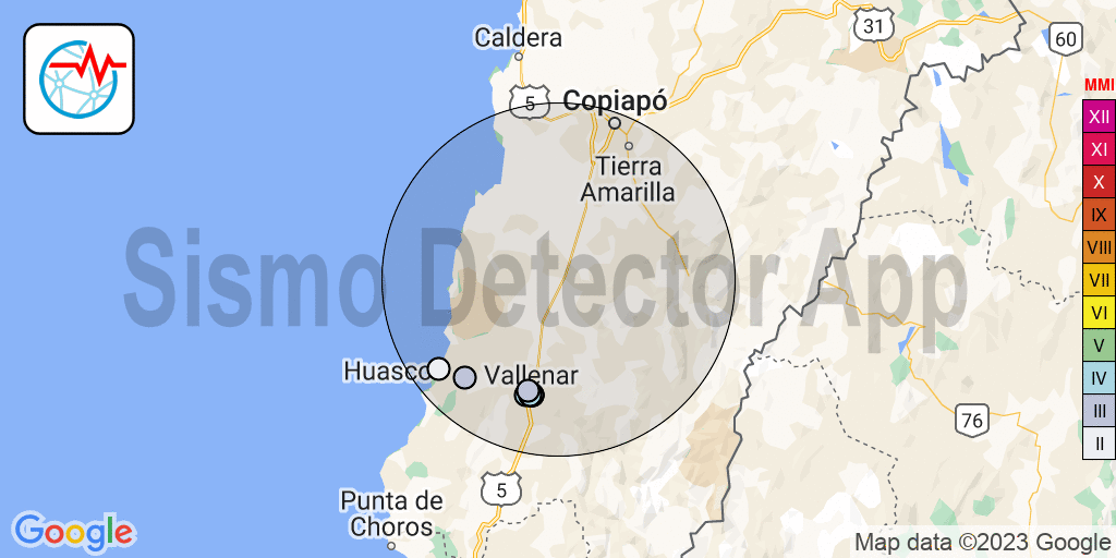 Un sismo se sintió hoy martes 4 de abril de 2023, 03:52 UTC, a 1km de Vallenar, Chile. El sismo fue reportado por 67 usuarios de la aplicación Sismo Detector en un radio de 86km. Magnitud preliminar entre 4.1 y 4.7.